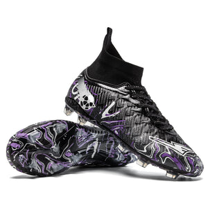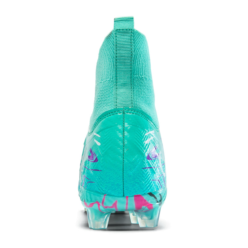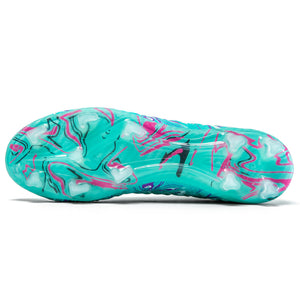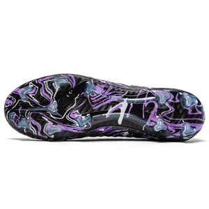 Stand out on the field with bold, artistic color options: Cyan/Purple, Black/White/Purple, Black/White/Teal, Pink/Black, and Gold/White. Each pair features a striking abstract graffiti design that blends professional performance with unique street-style flair, suitable for youth and adult players.