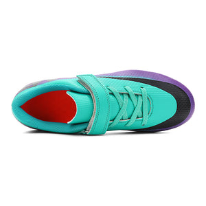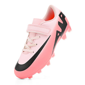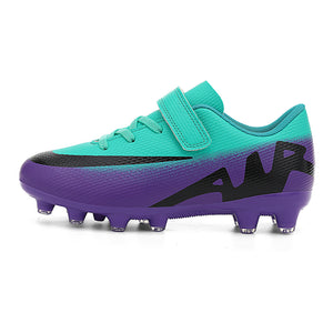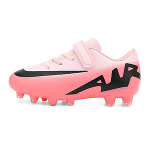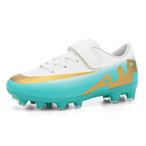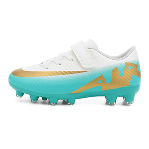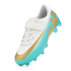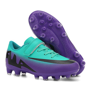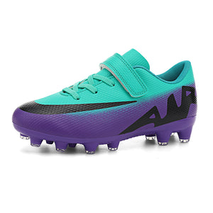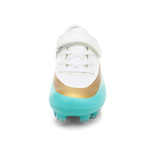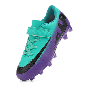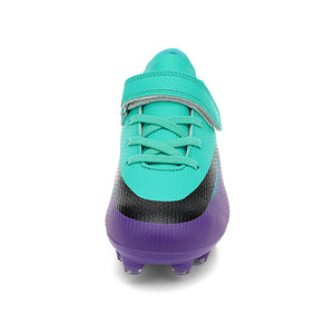 Choose from fun, high-visibility color options: Teal/Purple, Pink/Black, White/Blue, White/Teal/Gold, and Black/Blue/White. Each pair features a sleek low-top silhouette, bold gradient accents, and a durable synthetic finish, perfect for young soccer players to show their style on the pitch.